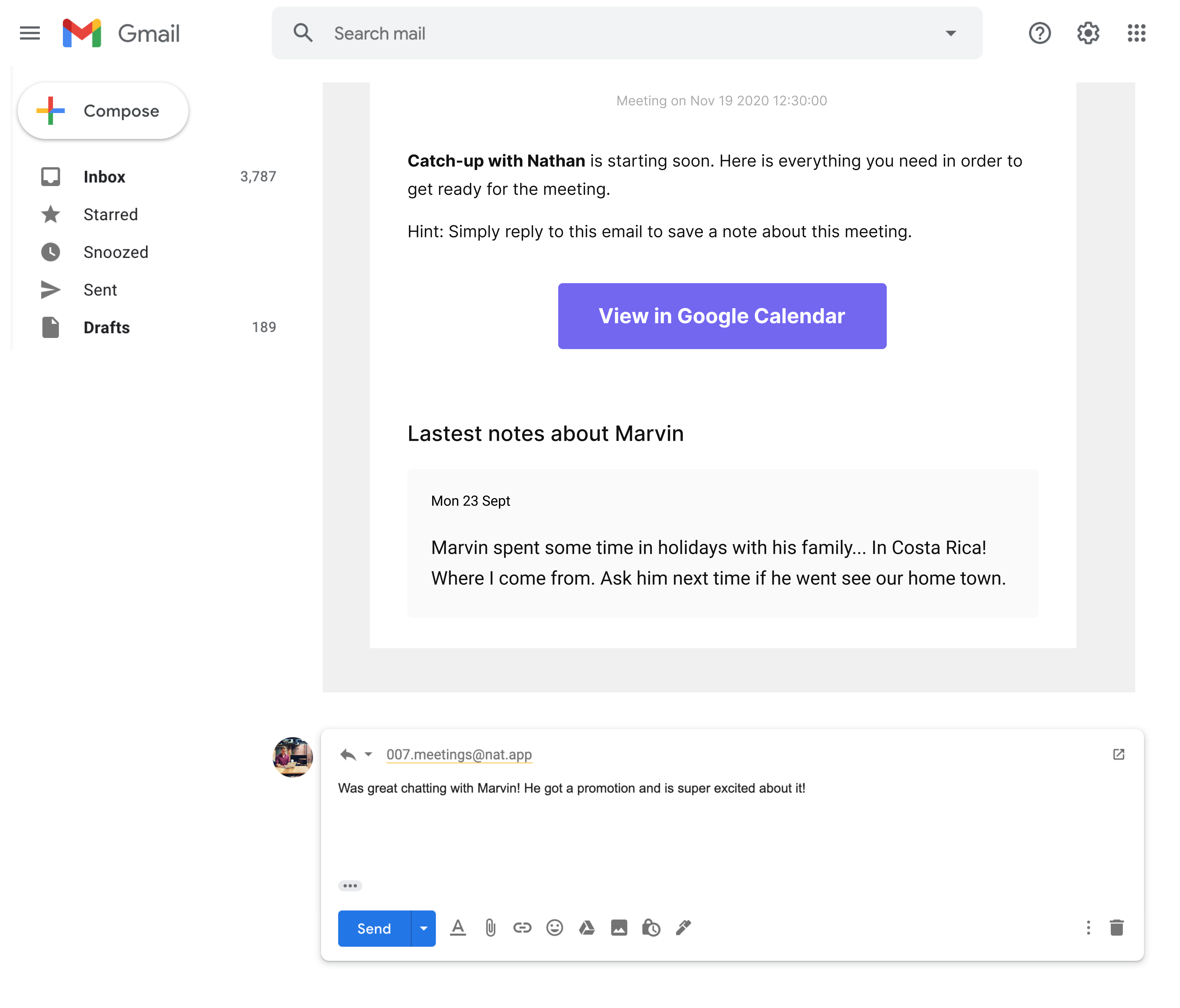 We email you before every meeting. Simply reply to the email to log a note.